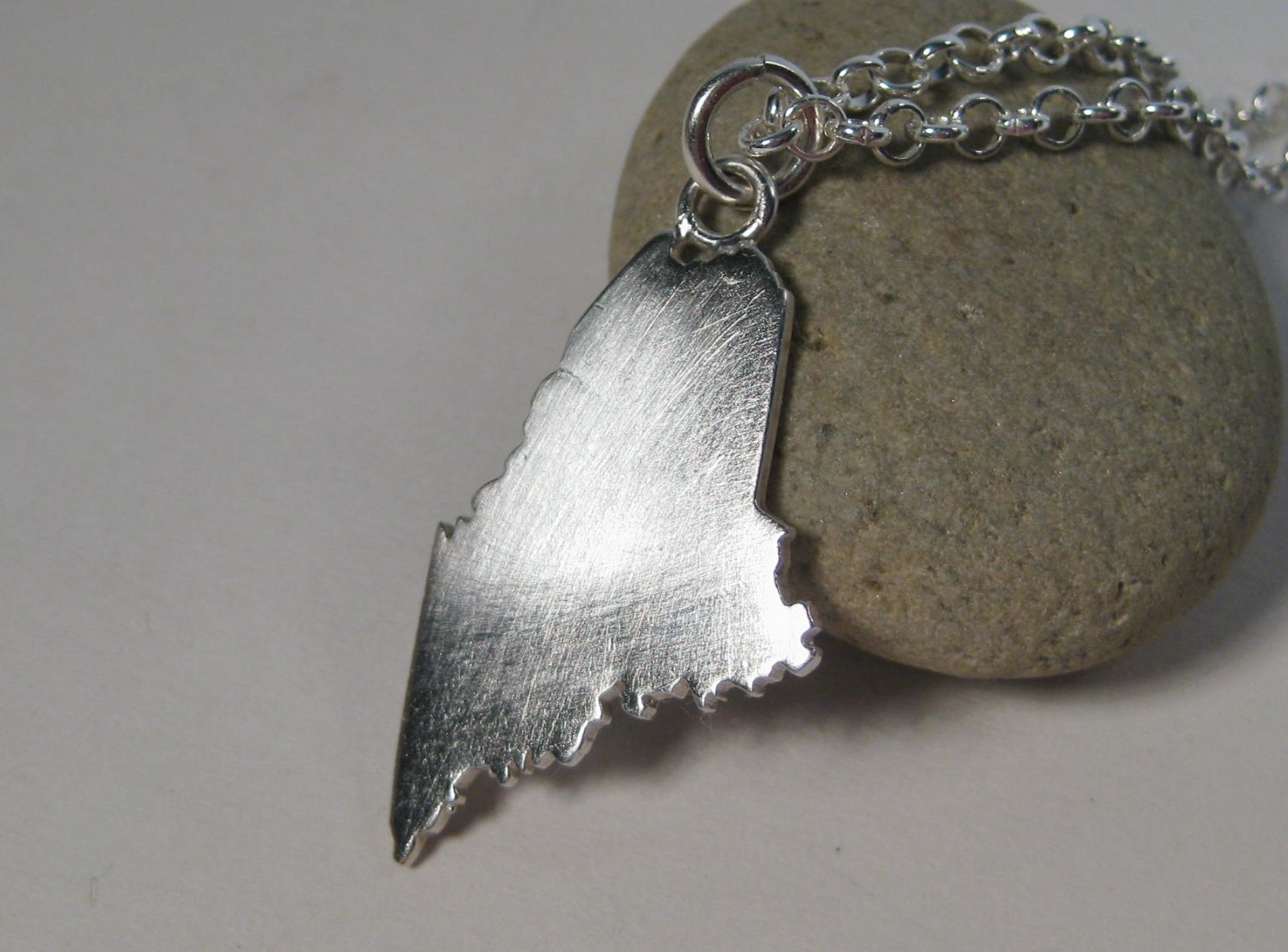 Hand cut sterling silver silhouette of the Great State of Maine. This pendant is worn daily by Our Governor, The Honorable Janet Mills.