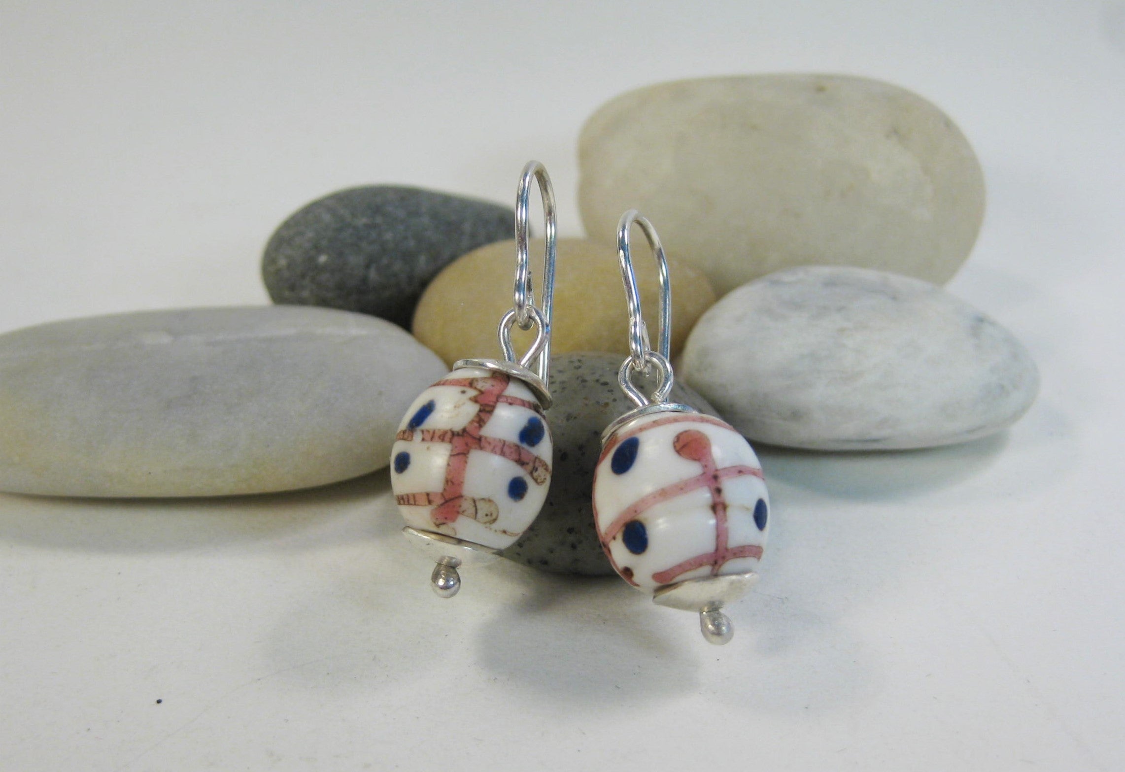 Over three hundred year old Venetian glass beads in delightful summer colors. These beads were selected from dozens that were purchased from a contemporary African salesman. This design is a traditional one used in countless beads and is one of my favorites. The ear wires and bead caps are sterling silver and made especially for these beads, not purchased from a findings supplier