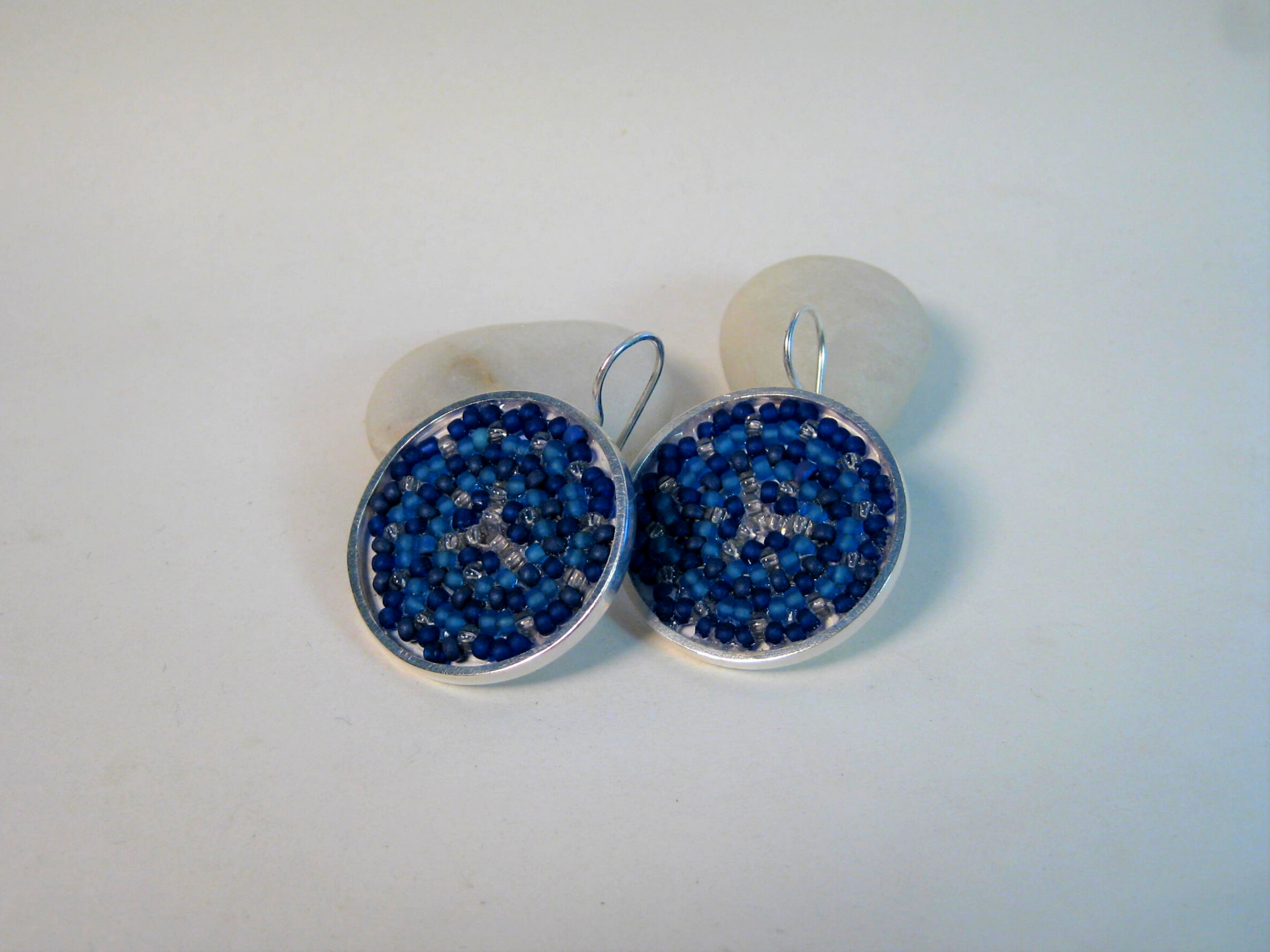 Very fine Japanese glass seed beads woven together and set in handmade sterling silver earrings. 22 mm diameter. Also available with ear wire or posts and in many other colors.