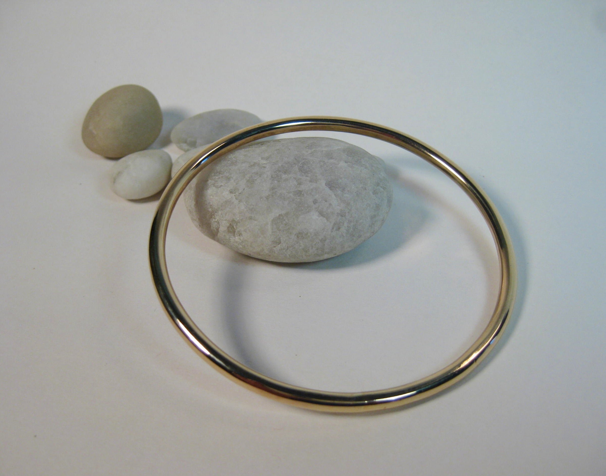 Heavy gauge gold filled wire ( 3mm diameter ) formed by hand and soldered into a bangle that can stand on its own or be worn with your collection. This high quality alloy of gold will stand up to daily wear for years to come. These can be made in any size you require. Standard inside diameter is 2.5". A true classic.