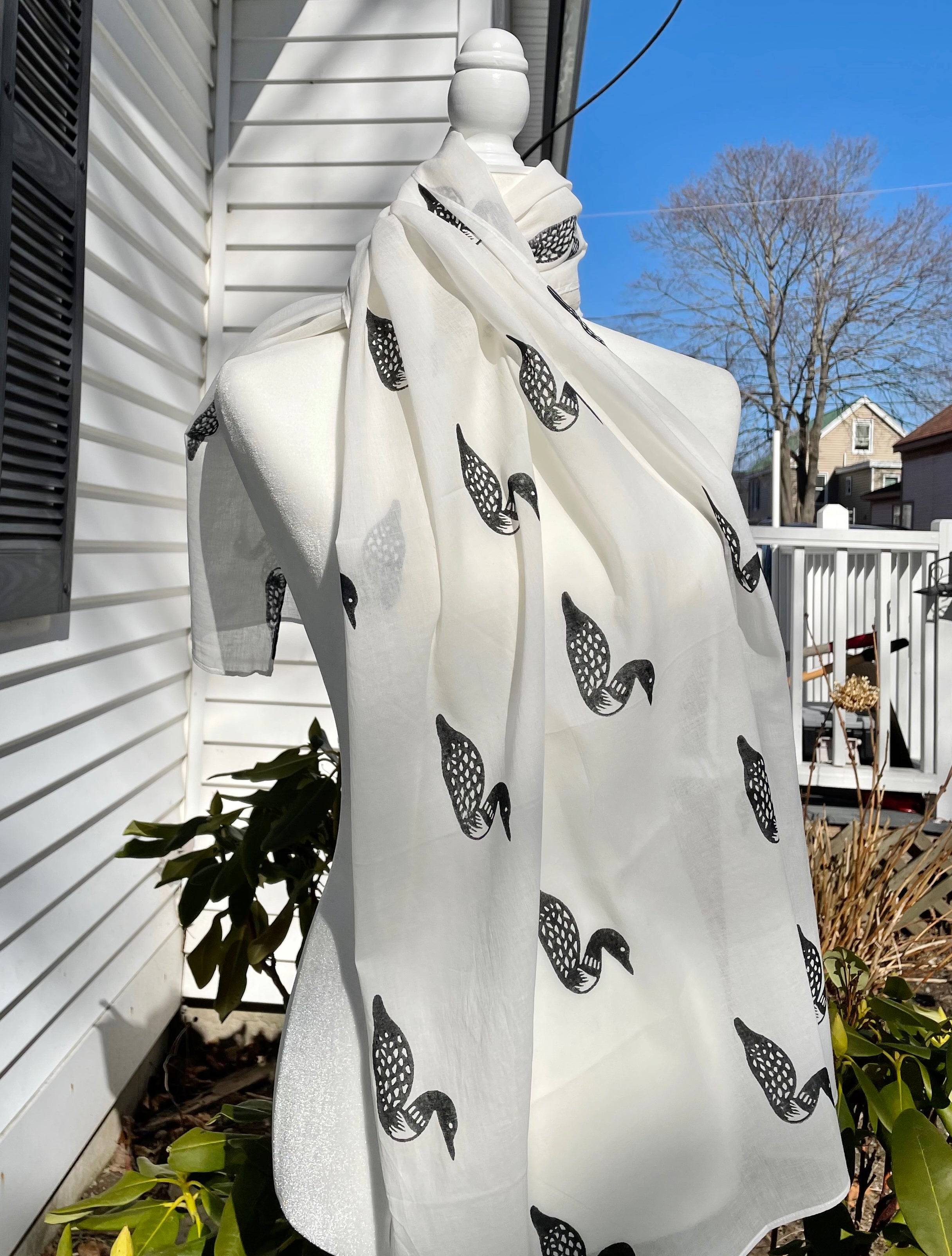 For lake lovers there is nothing like the call of the loon. Here they are block printed on fine Indian cotton. This is perfect for comfort in the lakeside breezes of summer. 20"x60". Machine washable