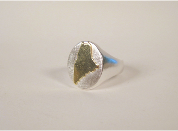 Solid sterling silver ring, in the tradition of a signet ring, shows off the silhouette of the great state of Maine, hand cut from 18k sheet and soldered to the surface. Oval measures 5/8" across. This ring is appropriate for both men and women, making it a perfect heirloom for the future. Available in most sizes.