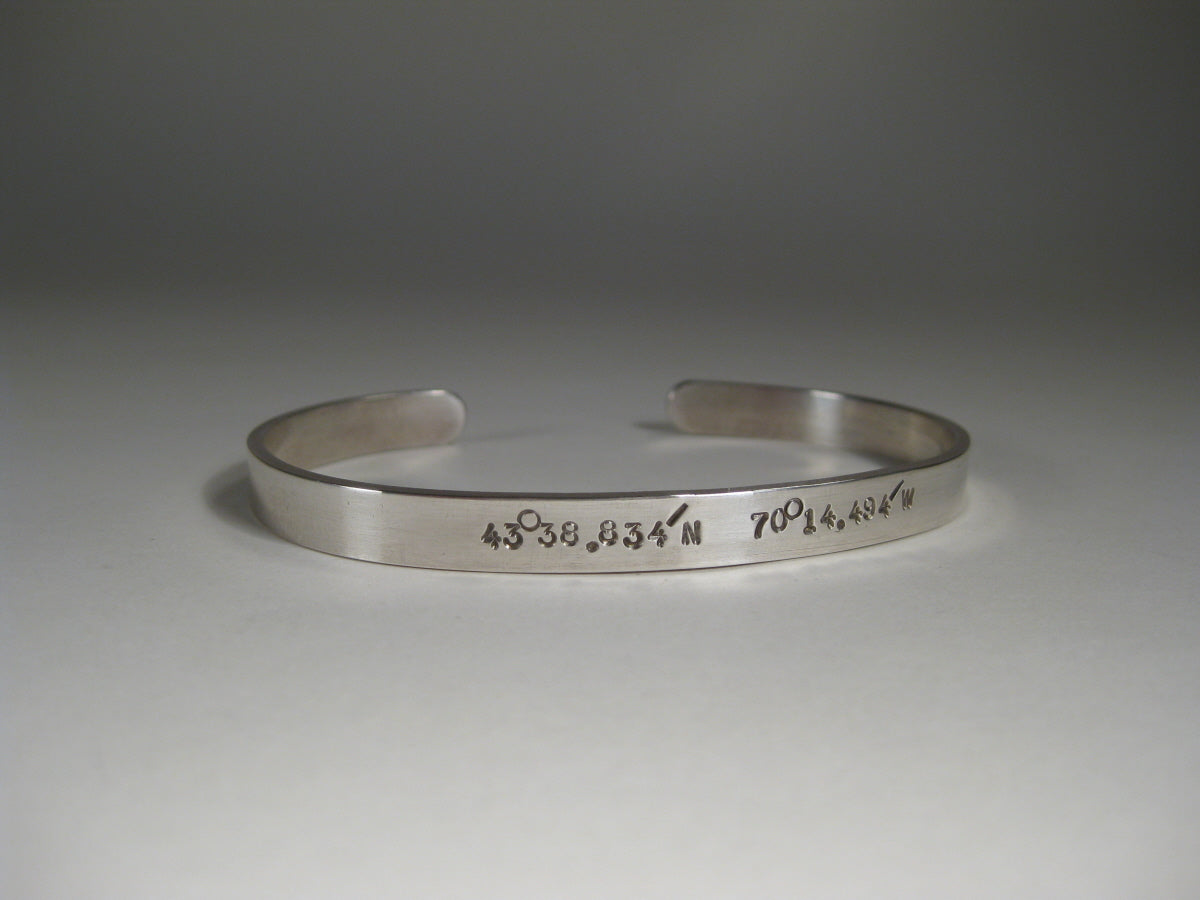 Men's standard size 6mm wide x 1.5mm thick sterling silver cuff bracelet hand stamped with the lat and long coordinates of your choice. 6 5/8” around w/ ¾” opening.