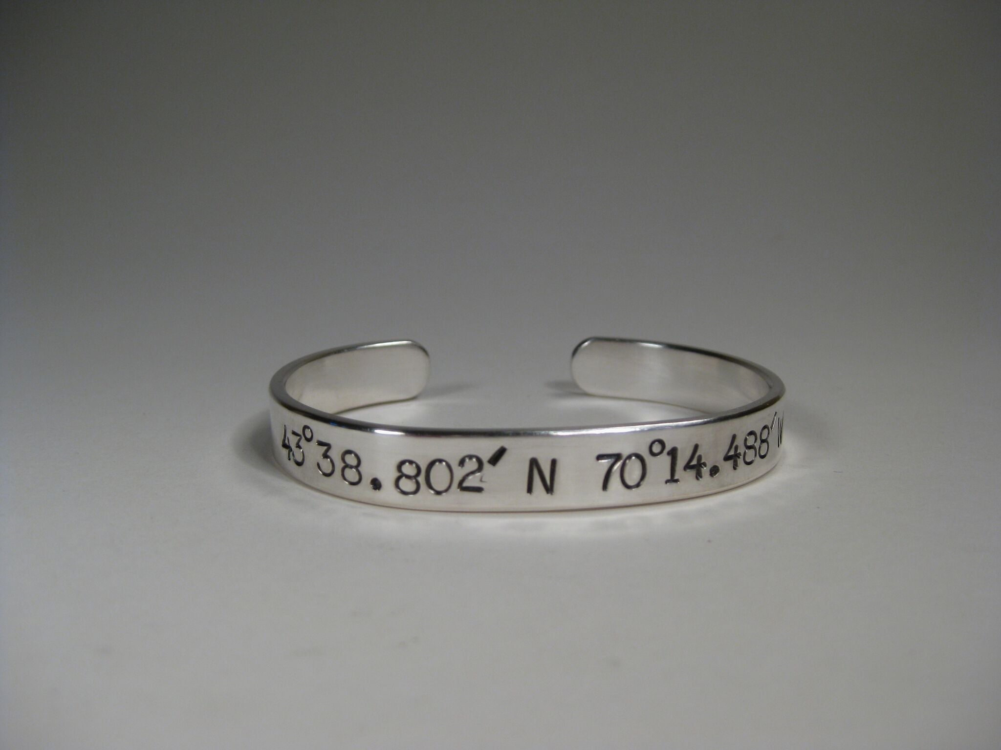 This large text cuff bracelet displays the coordinates of any place you choose.